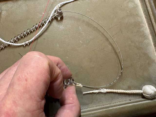 玉はまばらな穴を除けばしっかりと磨かれてて文句はない。中糸を通そうと親玉の縛り部分に目をやるとななんか変。結びがないのだ。